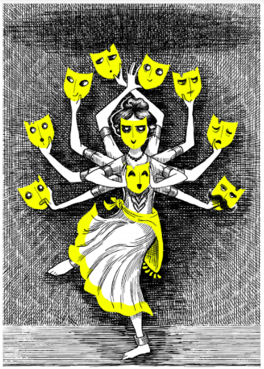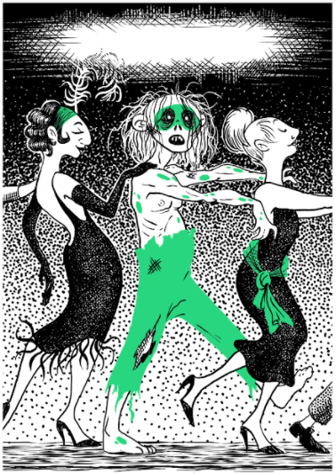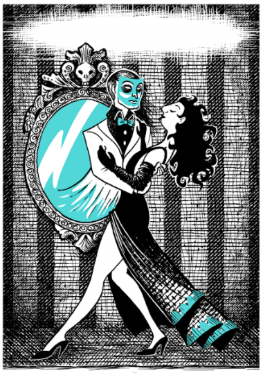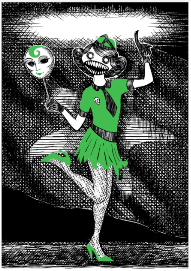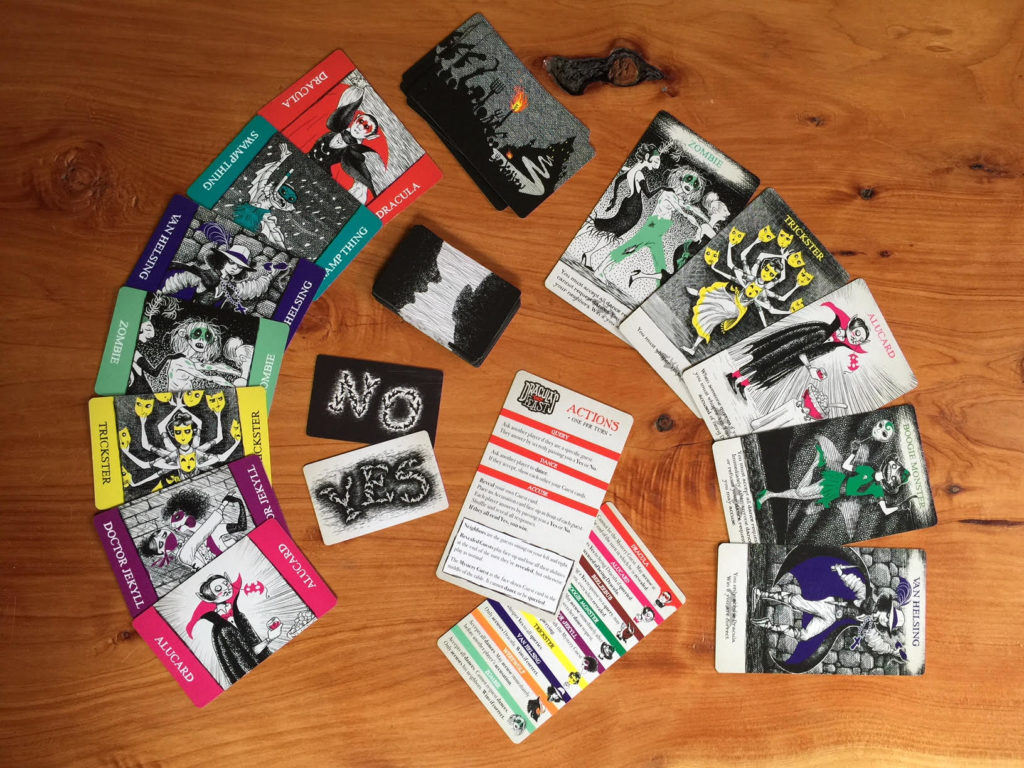 The midcentury gothic illustrations of Edward Gorey were the primary style touchstone for this project. With such a black-and-white style, my greatest challenge was to find a way to keep the cards from blending together, and to strongly differentiate one character from another, as identification of roles is a core mechanic of the game. I emphasized the differences from character to character by always using a different texture/pattern for the background, but the use of a single bold colour as a visual signature for each character was the main solution I brought to the table, and it’s effective while still maintaining that odd Gorey mix of horror and silliness.