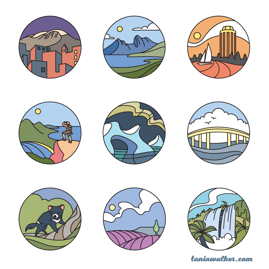 I moved to Tasmania in 2010 out of sheer love for the environment here, so this job allowed me to explore something dear to my heart. To keep the feel of the illustrations in keeping with the computing world, I opted for flat colour and use of single-width black line throughout the illustrations. Using each circle as a little window into the world of Tasmania, I worked to evoke the mountain, the forests, the river mouth, the lavender farms, the bridge, the wildlife, and Tasmania’s almost unique proximity to the magic and majesty of Antarctica.